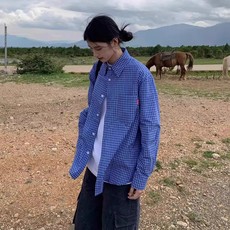 美式复古蓝色格子衬衫男女春秋季慵懒风翻领宽松休闲长袖衬衣外套