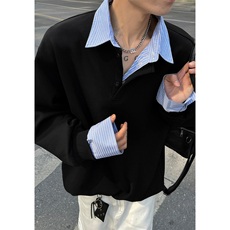 Quentin Marx日系纯棉男士假两件条纹衬衫长袖衬衣宽松休闲潮牌秋