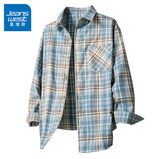 美式蓝色格子衬衫男新款秋季潮牌青少年长袖衬衣复古百搭休闲外套