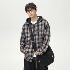美式复古连帽衬衫男款秋季潮牌格子长袖外套男生高街宽松休闲衬衣