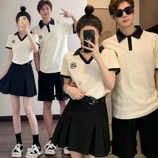 情侣装套装polo领t恤夏季法式学院正肩短款小上衣一长一短ins潮牌