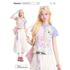 Fun潮牌短袖t恤女短款2025夏季新款加菲猫联名印花休闲圆领上衣
