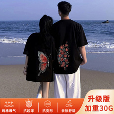 美式复古刺绣蝴蝶纯棉短袖t恤男女夏宽松港风潮牌大码300斤侣上衣