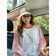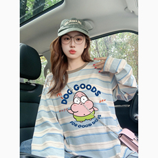 橙色条纹潮牌卡通长袖t恤女早秋复古宽松慵懒风减龄小众上衣外套