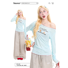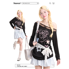 NERESUM美式手绘印花斜肩短袖T恤女潮牌辣妹星星纽扣设计感上衣潮