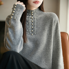 淑女风半高领蕾丝珍珠装饰针织衫女灰色加厚毛衣洋气保暖打底上衣