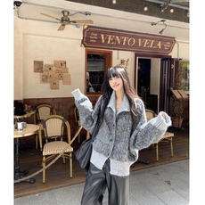 oneup绵羊毛麻花拉链毛衣外套女秋季灰色宽松慵懒半高领针织开衫