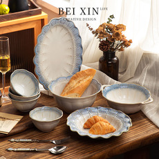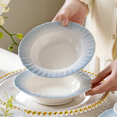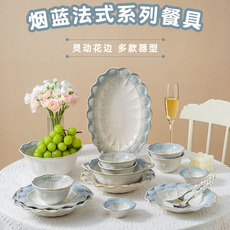 法式烟蓝花边陶瓷餐具套装釉下彩家用盘子大汤碗北欧简约
