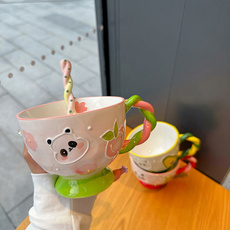 高颜值陶瓷燕麦片手柄早餐碗立体手绘浮雕生日礼物可爱熊猫水杯子
