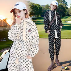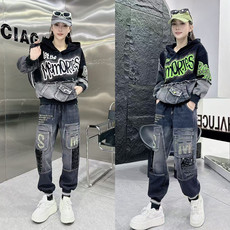 牛仔套装女2025春秋新款字母印花连帽卫衣复古时尚休闲运动两件套