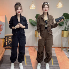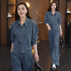 2025春秋季新款复古牛仔套装女休闲翻领短款外套哈伦工装裤两件套