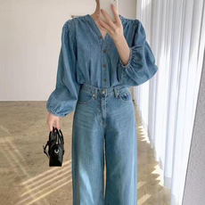 韩国chic春季复古洋气V领长袖牛仔衬衫+高腰休闲直筒阔腿裤套装女