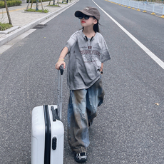 女童夏装套装韩系潮酷穿搭炸街复古破洞废土风短袖休闲宽松牛仔裤