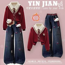 真维斯童装女童加绒套装秋冬款儿童洋气休闲卫衣两件套女孩牛仔裤