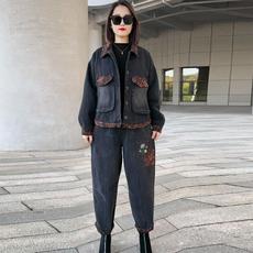 经典时尚牛仔套装女冬季新款时髦翻领短款外套+休闲阔腿裤两件套