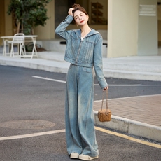 复古港风牛仔套装女2023秋季新款设计感短款外套直筒阔腿裤两件套