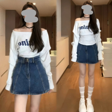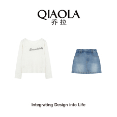 乔拉【小城午后】早春季白色字母印花针织衫上衣牛仔半身裙套装女