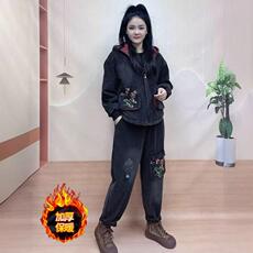 加棉加厚牛仔套装时尚贴布刺绣女冬季新洋气显瘦外套哈伦裤两件套