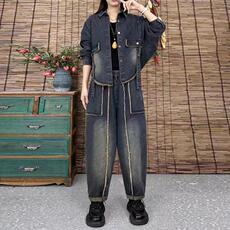 时尚复古休闲牛仔套装女2025春秋新款短外套高腰直筒阔腿裤两件套