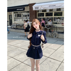 迟伞伞 梨花女高 牛仔刺绣标衬衫&蕾丝花边牛仔裙裤时髦套装女