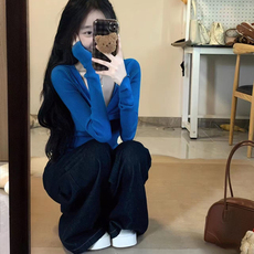 乔拉【水星手信】秋季新款慵懒百搭蓝色翻领衬衫毛衣牛仔裤套装女