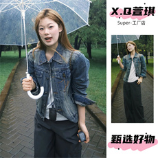 美式复古水洗做旧牛仔外套女春秋宽松慵懒chic小个子短款上衣夹克