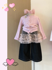 女童碎花开衫春秋装2026女宝叠穿带屁帘牛仔裤小碎花短款上衣外套