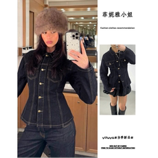 唐狮秋冬新款女牛仔外套减龄翻领小个子短款独特女士上衣小香风tu