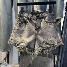 破洞牛仔短裤女外穿薄款夏季2025新款高腰显瘦a字毛边阔腿热裤子