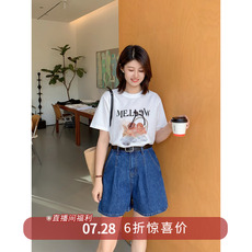 大码女装胖mm春夏牛仔短裤高腰百搭宽松显瘦阔腿a字短裤31755。