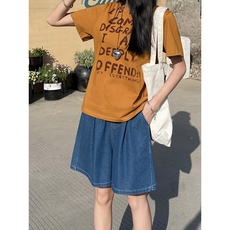 黄色牛仔五分短裤女夏季薄款高腰显瘦宽松直筒a字遮胯阔腿中裤潮
