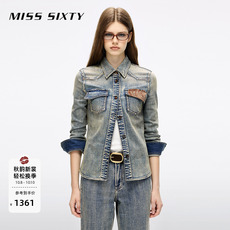 Miss Sixty2025秋季新款长袖牛仔衬衫女翻领复古洗水拼贴设计感