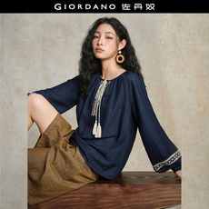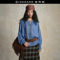 设计师款佐丹奴女装秋冬新款荷叶边宽松翻领长袖牛仔衬衫18345222