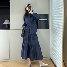 熊宝家早秋复古文艺套装~立体花朵亚麻牛仔长袖衬衫+高腰半身裙女