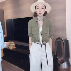 欧美 复古帅气ol气质军绿水洗做旧色长袖宽松单宁牛仔衬衫 女纯色