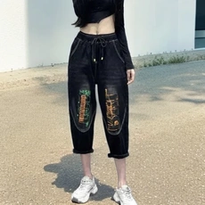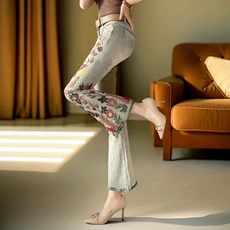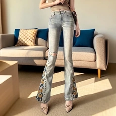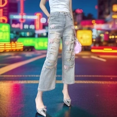 2025夏季新款潮流个性刺绣破洞百搭牛仔裤女修身显瘦九分裤喇叭裤