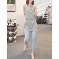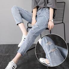 浅蓝色个性破洞牛仔裤女夏季薄款显瘦显高八九分小直筒哈伦裤子潮