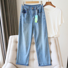 大码九分牛仔裤女夏季薄款胖mm宽松显瘦冰丝垂感高腰直筒阔腿裤子