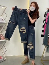 白色九分裤女松紧腰牛仔裤弹力大码胖mm显瘦哈伦裤破洞洋气春季潮