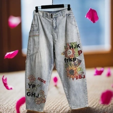 新中式国潮刺绣阔腿牛仔裤女2025秋装小个子宽松显瘦九分直筒裤子