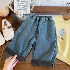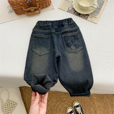 女童加绒牛仔裤宝宝秋冬款韩版蝴蝶结宽松一体绒长裤冬装休闲裤子