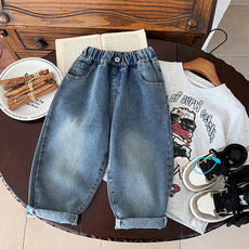 儿童洋气复古做旧牛仔裤2025新款韩版男女童秋季宽松直筒百搭长裤