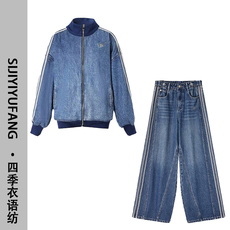 韩版休闲立领三条杠短款夹克外套女2025新款宽松牛仔阔腿裤两件套