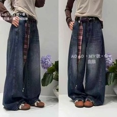韩版复古格子拼色牛仔哈伦裤女秋冬2025年新款宽松显瘦九分休闲裤