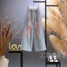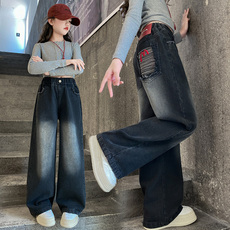 欧美女童装春秋季复古破洞牛仔裤韩版大童新品时尚百搭宽松阔腿裤