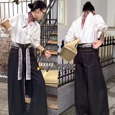 刺绣阔腿牛仔裤女秋季新款韩版丝巾腰带百搭宽松休闲直筒裤世0.89