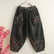 牛仔磨白五角星贴布字母刺绣九分牛仔裤女大码宽松薄款哈伦灯笼裤