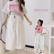 150小个子九分白色阔腿牛仔裤女秋季休闲宽松高腰显瘦直筒长裤155