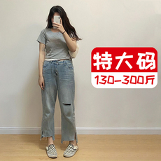 300斤大码ins开叉破洞牛仔裤女夏季微胖mm宽松显瘦百搭九分直筒裤