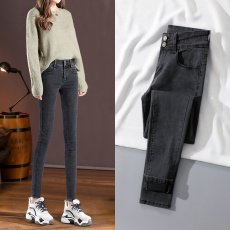 烟灰色小脚牛仔裤女新款显瘦2023秋冬季高腰弹力加绒紧身铅笔裤子